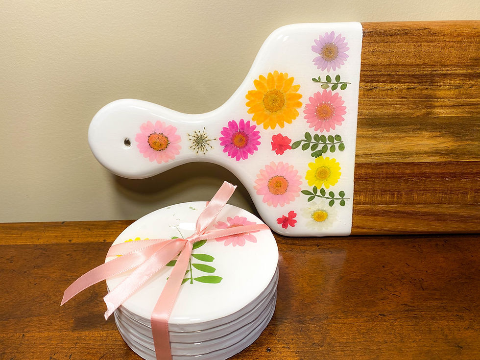 All boards and ceramic coasters are made with with real pressed flowers and covered in three coats of clear epoxy resin. Wood is finished with coats of food safe mineral oil. Coasters are finished with cork backings.